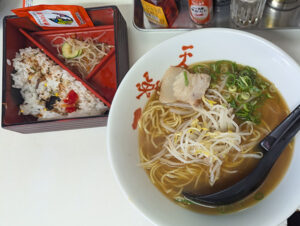 そんな弁当はお楽しみにとっておき、昼メシは近所にある行きつけのお店でラーメン定食。ツアー中のラーメンはホント連鎖しがち。