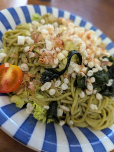 昼メシは駒ヶ根から名古屋への移動中に買った”茶そば”で冷やしたぬきを再現。