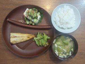 昼メシは冷蔵庫のありものだけでサクッと組み立てる。白飯さえ美味しく炊ければ十分満足。
