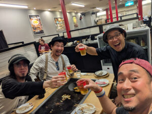 ベタだけど御当地メニューの”お好み焼き”とビールでテンションを上げておく。いつでも一緒のメンバーはホント仲良し。笑
