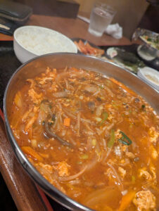 久々食った韓国料理屋はまた厨房の人が中東系の人に変わってて、ユッケジャンは肉の入っていない野菜スープで出てきた。笑