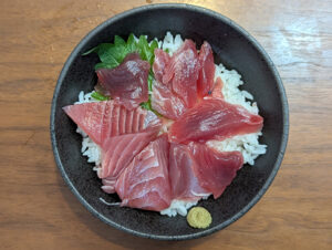 買ってきたのは”生カツオ”なんだけど、新鮮なカツオをご飯の上に乗せて醤油とわさびで食べるのが大好物。昔仕事場の近くのランチでこれを出してる店があったんだけど、週2くらいで通ったこともある。