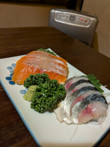 そして食べたかったサーモンとサバの刺身。サーモンなんて北海道以外じゃ食べないけど、北海道のサーモンは脂のノリがマジ別格。そしてこの店のサイズ感が半端なく大好き。