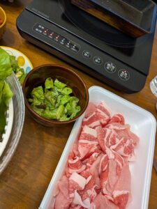 青唐辛子の代わりに今回はししとうを使ってみた。ホットプレートを出すのも大げさだったので、IHに卵焼き用のフライパンを乗せてやってみたらいい感じのコンパクト感で上手くいった。