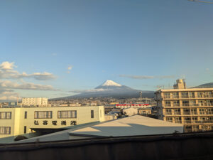 そこから1時間ほどで新富士駅を通過した後くらいに富士山が一番きれいに見えるスポットを通過。今年もいい感じに晴れて美しい富士山を拝めた。