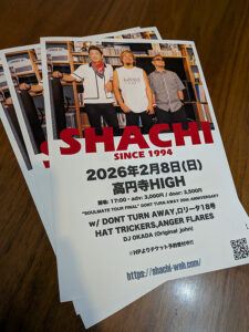 そこで「SHACHIが行きますよー」ってわかりやすく表現できるフライヤーが良いなーって事になって作ってみた。